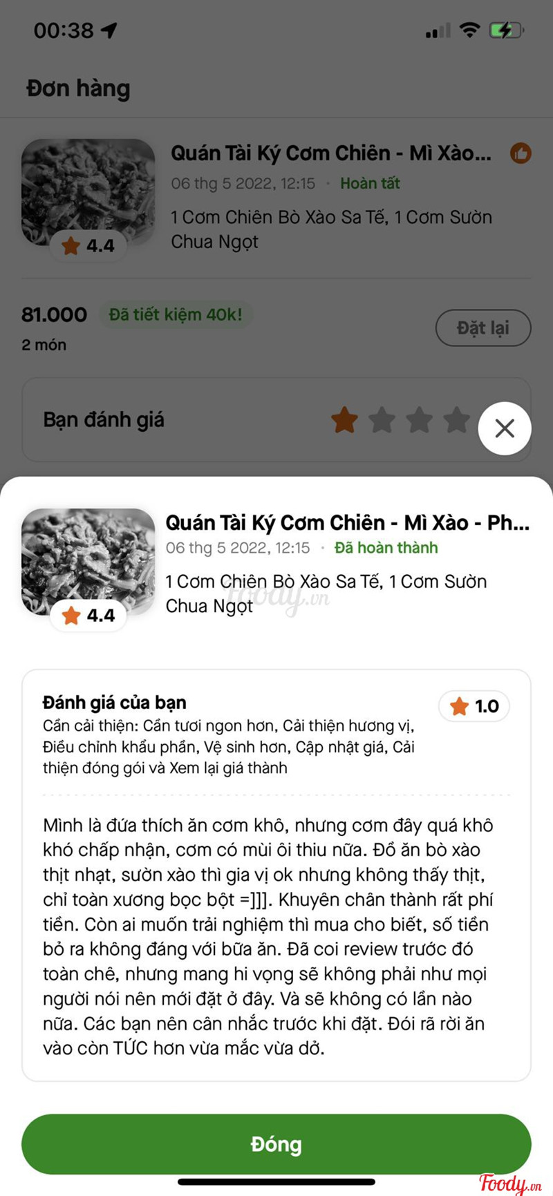 1.0Quá tệQuán này chắc chịu khó đi Seeding lắm. App nào cũng trên 4 sao. Mà đồ ăn thì quá tệ, các bạn nên đọc bình luận trong hình rồi mua nha. Lúc mình dùng bữa cũng vội nên chẳng thèm chụp ảnh cho các bạn xem. Giờ ngồi cmt như này mà thấy vẫn còn ớn. Quá sợ quán ạ. ...Xem thêm