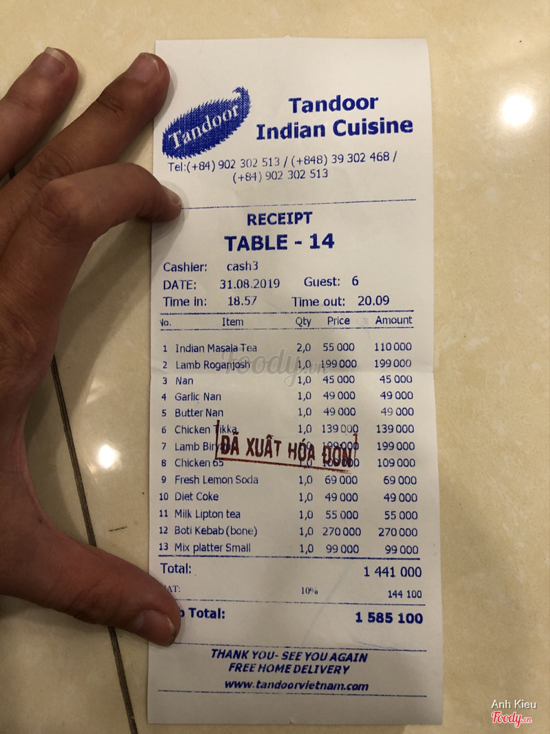 Không gian và vị trí nhà hàng cực đẹp, rất sang chảnh. Phục vụ rất tận tình, đây là lần đầu mình đi ăn món Ấn nhưng anh tư vấn rất kĩ. Có lẽ mình ăn không quen món Ấn nên cảm thấy chua nhưng người nhà mình lại thích, bảo lạ miệng. Ăn cả nhà 5 người hết 1tr6 (nhưng nhà mình ăn hơi yếu), mình cảm thấy giá này là rất rẻ so với không gian, vị trí và cung cách phục vụ. ...Xem thêm