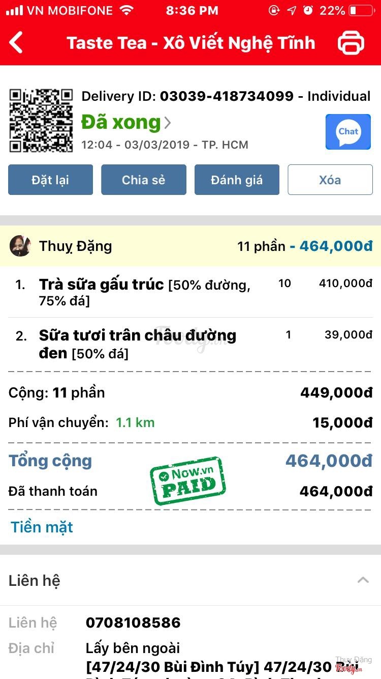 9.4Taste Tea - Xô Viết Nghệ TĩnhĐặt hồi 3/3 rồi mà giờ mới viết review cho quán nè. Quán này đợt mình có uống ngoài Đà Nẵng, uống ngoài đó siêu ngon nên nay uống tiếp. Đợt này sinh nhật em mình nên đặt tới 11 ly lận. Trà sữa Gấu Trúc (41k): Trà sữa này có trân châu trắng đen, đóng gói kĩ càng. Trà sữa thơm, hơi ngọt. Trân châu đen mềm nhưng vẫn dai, trân châu trắng uống nhai giòn giòn khá đã Sữa tươi trân châu đường đen (39k): Sữa tươi trân châu đường đen ở đây ổn, thơm mùi đường đen. Trân châu cho nhiều quá trời luôn, khá nhiều so với những gì mình phải trả. Sữa tươi không ngọt lắm, trộn đều với đường đen ok lắm. Recommend món này trong số những món mình đã uống. Nhìn chung thì đóng gói siêu cưng, bao giấy nhìn sang và đẹp. Đặt 11 ly mà chưa tới 30 phút đã giao cho mình rồi. Nằm ở mặt tiền khúc cua Bạch Đằng, lại lớn nên khá dễ kiếm. Đi ngang thấy quán sáng sủa, xinh nữa chứ. Nhân viên quán ở ngoài Đà Nẵng rất dễ thưỡng, không biết trong thành phố thế nào nhưng chắc chắn cũng sẽ có nhiều nét chung giống ngoài Đà Nẵng. Nói chung là vẫn sẽ ủng hộ quán dài dài nè. Tổng: 464k ...Xem thêm