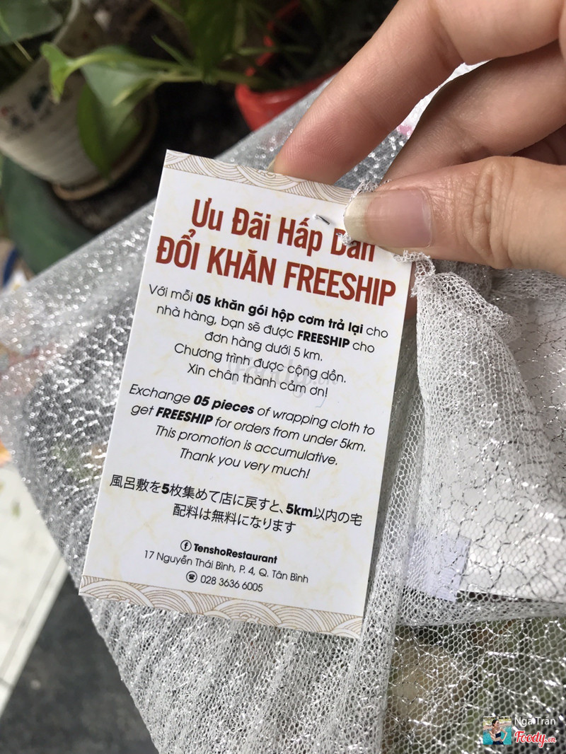 8.0Tensho - Cơm obentoMình đặt 1 phần cơm Obento Lườn cá hồi nướng qua Now. Shipper giao rất nhanh. Lúc nhận đồ ăn mình cũng hơi bất ngờ vì quán gói hộp cơm bằng khăn chỉn chu như kiểu Nhật. Hoá ra quán có chương trình thu thập đủ 5 khăn này là sẽ được freeship lần sau. Mà mỗi lần là 1 loại khăn khác nhau nên giữ lại kỉ niệm hoặc tái sử dụng cũng được nè. Phần cơm khá nhiều với đứa con gái như mình thì ăn no lắm. Lườn cá hồi nướng mềm thơm, sốt ngon, vừa đủ. Trong phần salad đi kèm có mỗi cái vụn bánh mì là ko được tươi thôi còn lại ổn hết. Có tăm và khăn ướt. ...Xem thêm