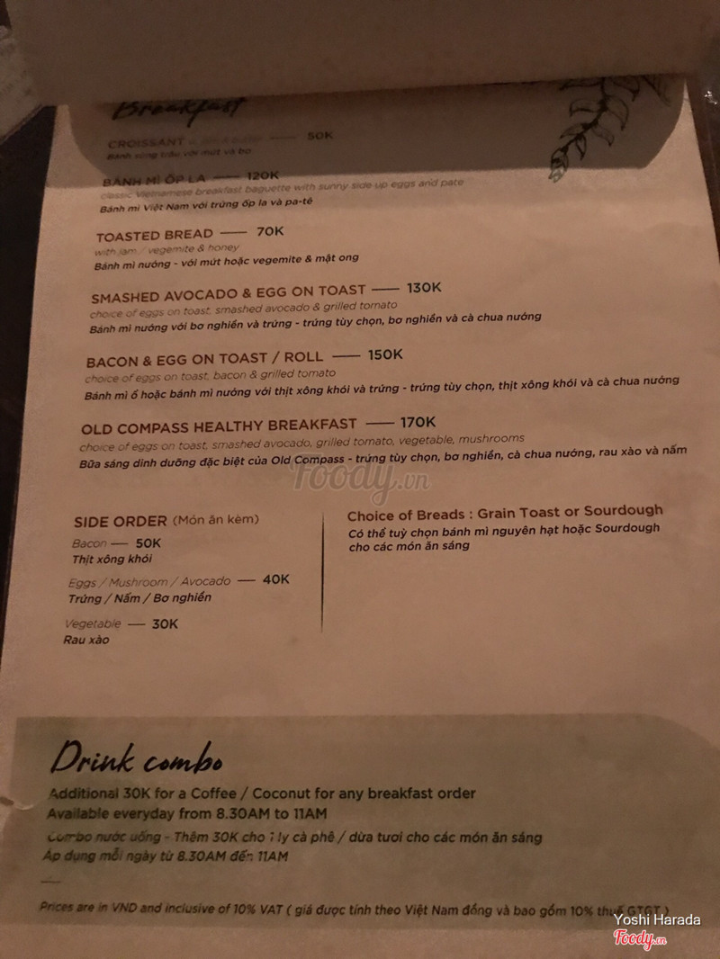7.6The old compass cafeQuán nằm trên lầu 3 chung cư trong hẻm cạnh khách sạn liberty central trên đường pasteur. Không gian yên tĩnh lắm, khách đa phần là khách tây nên lịch sự, đi ăn tâm giờ trưa đông nhưng không quá ồn ào. Set cơm có cả set cơm mặn và cơm chay kèm nước uống, 150k/phần, ăn khá ổn. Nhân viên thân thiện nhiệt tình. ...Xem thêm