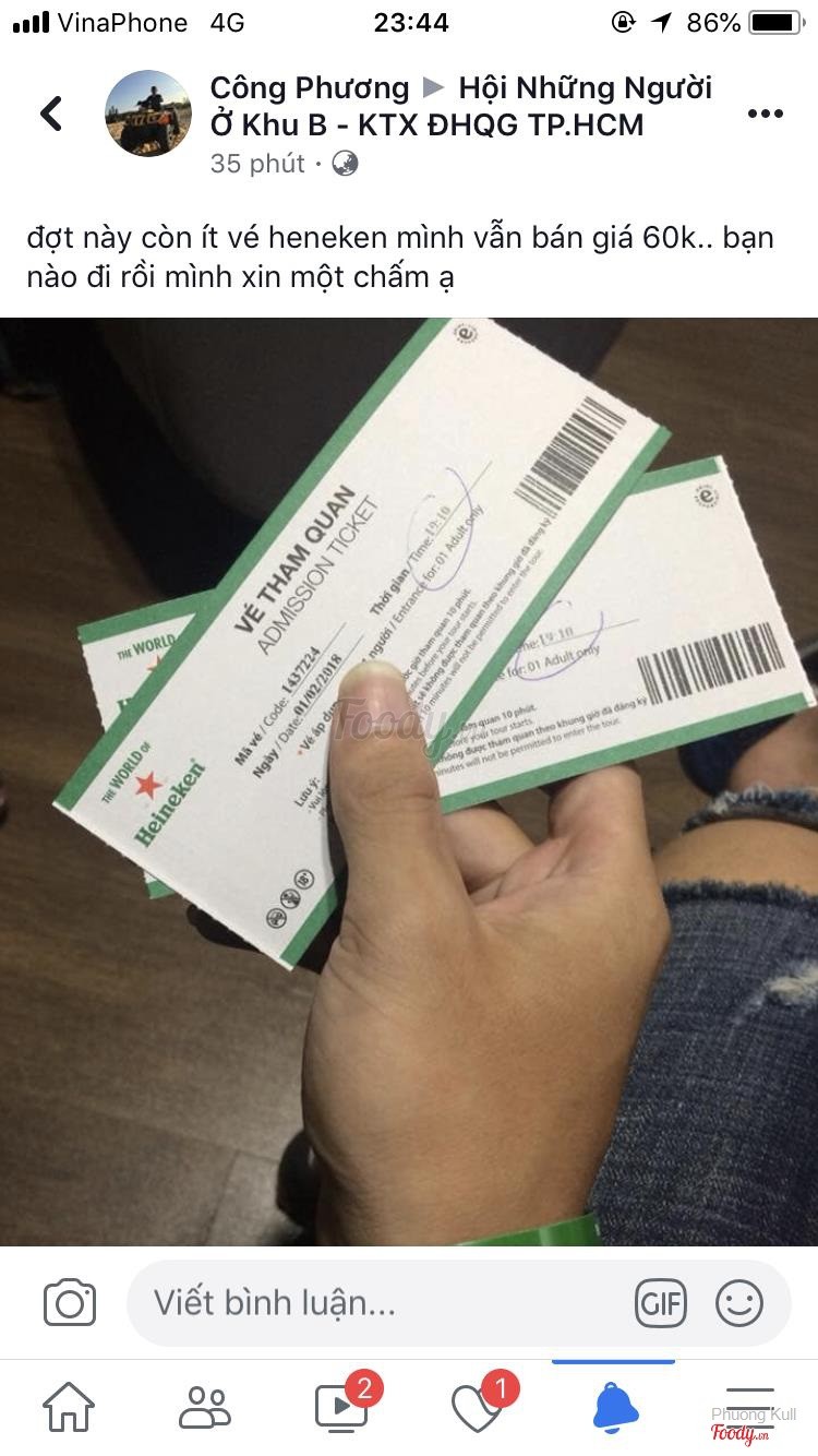 Mình còn 1 lượng vé tham quan trải nghiệm The World of Heineken không hạn sử dụng. Mọi người có nhu cầu nhanh tay liên hệ ngay cho mình nhé! Liên hệ: 0971.316.376 Hãy đến và trải nghiệm cùng Heineken! ^^Xem thêm- Đây là nhận xét từ Thành Viên trên Foody, không phải từ Foody Corp. -