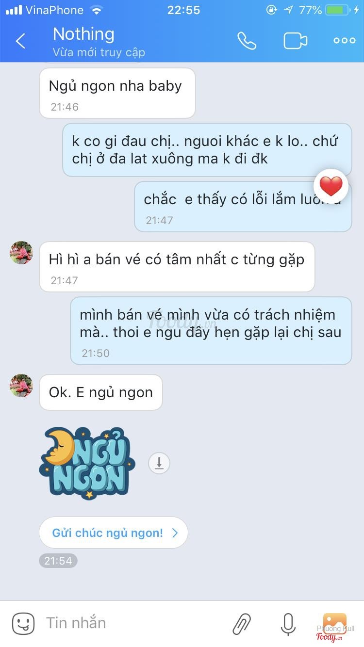 mình đã bán được mấy trăm vé .. nay về ít vé lại bán tiếp.. chủ yếu là vừa lòng khách hàng nên mình bán giá 70k 0919697274-0965946162 zaloXem thêm- Đây là nhận xét từ Thành Viên trên Foody, không phải từ Foody Corp. -