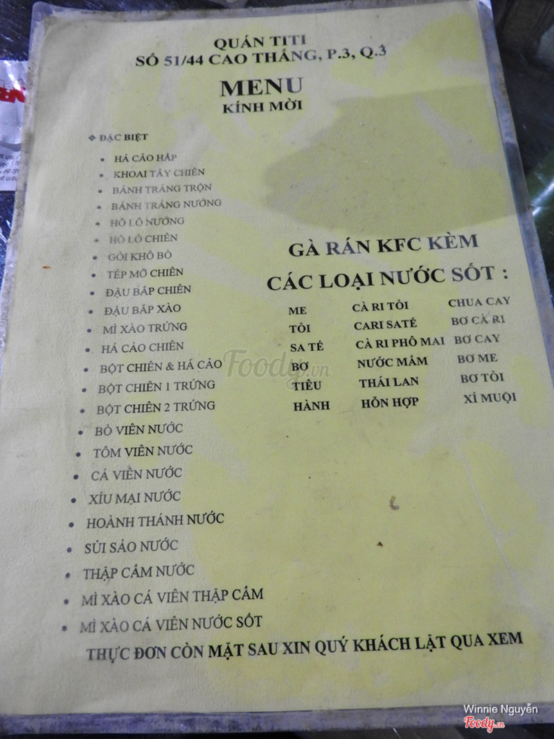 1.0Ti Ti Quán - Cao ThắngMấy bạn tránh xa quán này nha. Menu ko để giá, ai ngờ minh đi 2ng mà làm cho dĩa 50k. Ăn chả ngon lành gì mà chủ quán cũng thấy ghét nữa ...View more