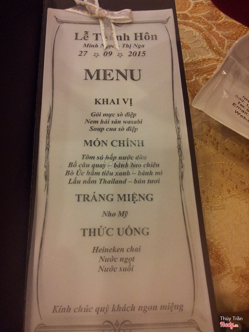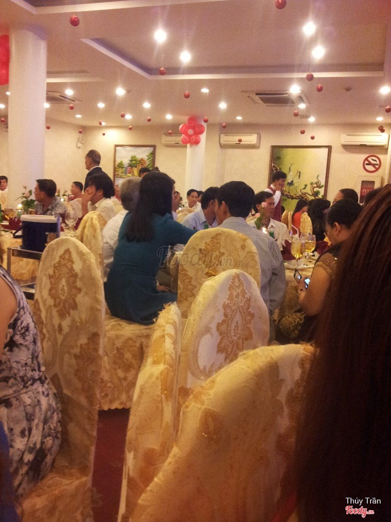 8.0Món ăn ở đây thật tuyệtMình từng tổ chứ tiệc ở đây! Phải công nhận là thức ăn nhà hàng rất ngon, khách ăn ai nấy đều khen, làm mình rất hài lòng, phục vụ cũng rất nhiệt tình nữa. Giá cả thì tùy theo thực đơn Khoảng từ 2.500.000/1 bàn trở lên , thường nhà hàng hay khuyến mãi bao luôn bia, và nước ngọt, nước suối Không gian sạch sẽ, sang trọng! Nói chung mình rất thích. Điểm trừ là không gian hơi nhỏ: Nếu đãi trên 30 bàn thì phải ngồi tràng ra ngoài sảnh, hoặc đãi 2 sảnh ( Nhà hàng chỉ có 2 sảnh, mỗi sảnh có sức chứa khoảng 30 bàn thôi). Sau này có tiệc tùng gì thì mình chắc chắn sẽ quay lại nhà hàng này! :) ...Xem thêm