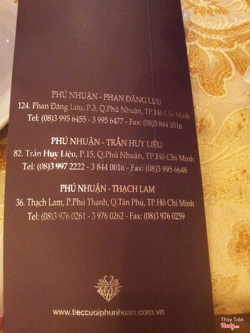 7.2Trung tâm tiệc cưới hội nghị Phú NhuậnMình được mời đi đám cưới ở đây. Nằm ngay mặt tiền đường Phan Đang Lưu hướng từ bình thạnh đến phú nhuận nằm bên tay phải luôn. Do đến trễ nên mình phải chạy vô trong hẻm giữ xe đi bộ mất 5p. Nói đi tiệc cưới thì được free. Nhà hàng nhỏ có 1 trệt, 1 lứng và 1 lầu thôi. Hôm dó lại bị cúp điện nên nóng kinh khủng. Đã vậy máy phát điện cũng bị hư nên buổi lễ phải dời đén 30p sau mà quản lý cũng không xin lỗi nữa. Bù lại các món ăn đều ngon hầu như ai cũng khen hết. Kết nhất món lẩu và bồ câu bánh bao chiên. Nhân viên phục vụ tạm được. sảnh hơi nhỏ. ...Xem thêm
