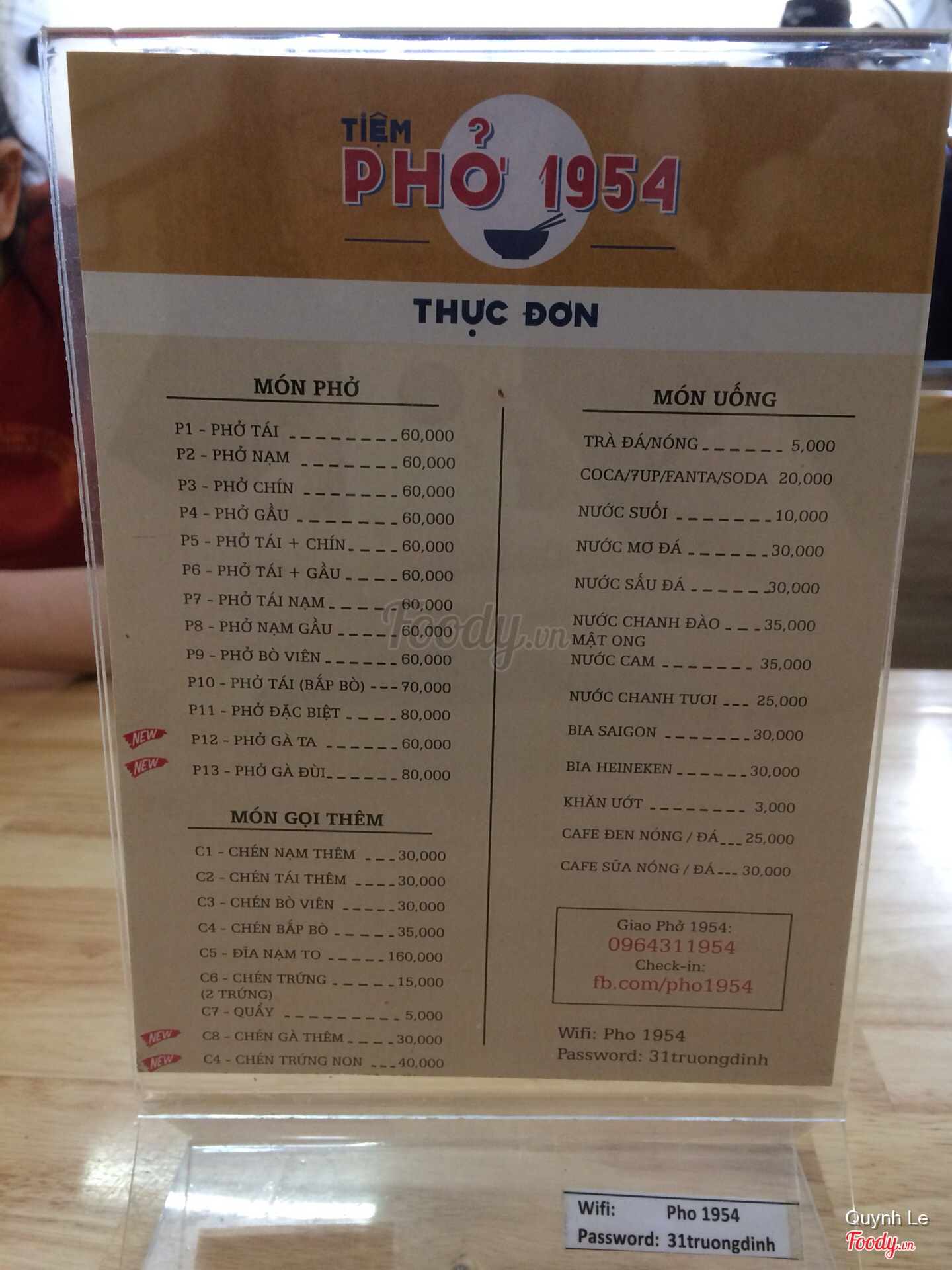 Thực đơn tiệm Phở 1954