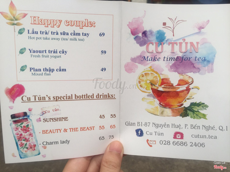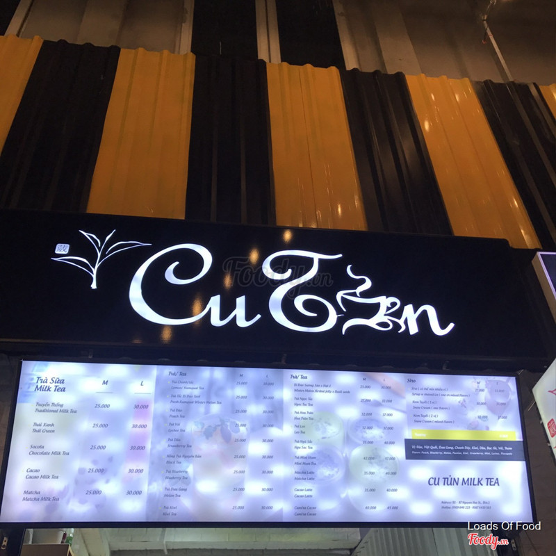 6.4Trà Cu TủnNằm trong khu Zone 87, quán khá nhỏ, nhân viên nữ trẻ trung tư vấn nhiệt tình lắm. Mình order một Trà Ngũ Sắc, vị hơi ngọt, có syrup và trái cây tươi cắt nhỏ. Nhìn chung take away giá như vậy là ổn. Sẽ quay lại thử các thức uống khác. ...Xem thêm
