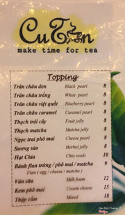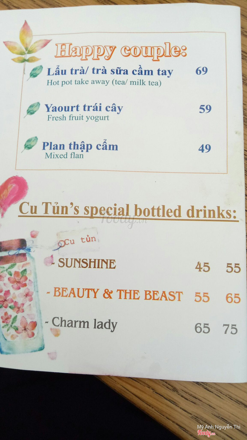 9.0Trà Cu TủnMình đã thử bên cu tủn. Giá cả của bên tủn hợp với túi tiền nhưng chất lượng ngon hơn mình nghĩ. Mình vs bạn mình ghé mua 2 ly mint mum vs thái. Trà mint mun lần đầu mình thử, lạ, ngon, không hề ngán. Vị bạc hà, vị chua, cộng thêm thạch giòn giòn... ún vào khá thích. Rất ngon lun ak. Còn bạn mình thích ún thái xanh, nó nhận xét ly thdi xanh của qán thơm vs đậm đà hơn những ly thái xanh ở những nơi nó từng ún... Giá cả cho 2 ly cũng chưa tới 100k nhưng theo mình nước ngon. ...Xem thêm