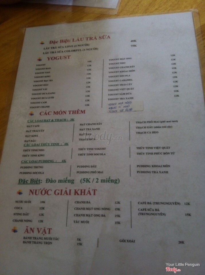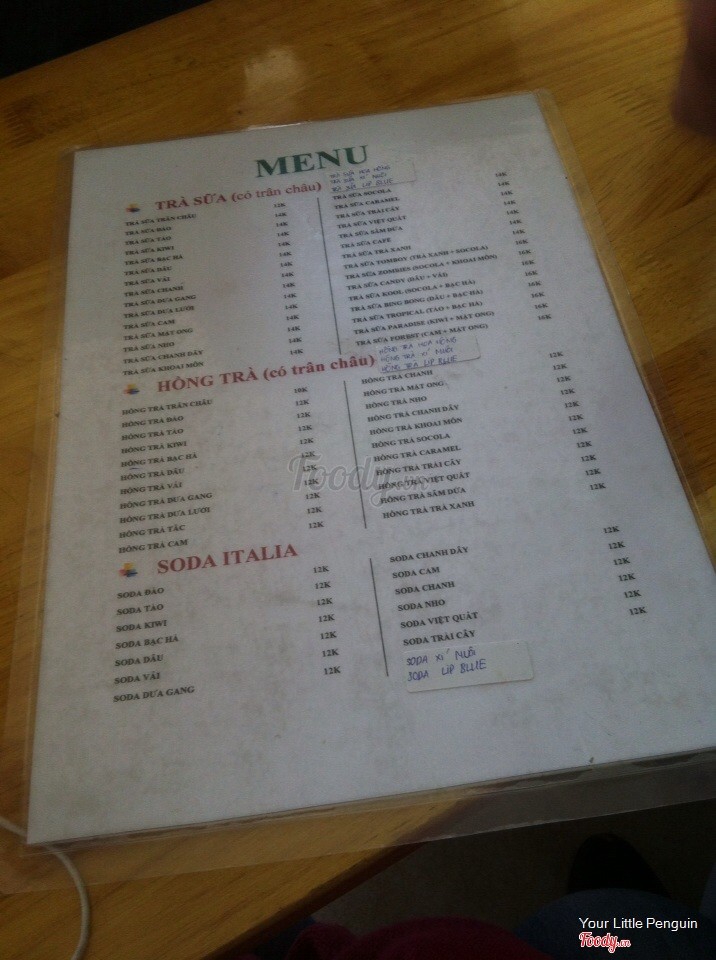 Ttà sữa khá ngon. Mình kêu cái lẩu trà sữa 4 nguời uống (mà đi 3 người) giá 70k được 7 loại thạch, tha hồ uống. Nếu bạn đi 2 ngừơi có thể kêu cái lẩu ttà sữa 40k. Soda, ttà sữa ly mình thấy giá cũng rất sinh viên 12k hay gì ak. Nhân viên rất nhiệt tình vầ vui vẻ. Mình thấy có dịch vụ giao hành nữa mà không nhớ sđt ...Xem thêm