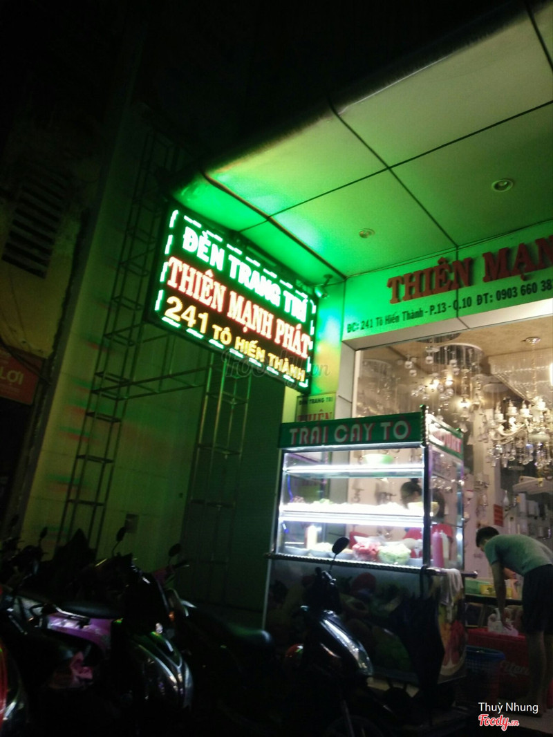 6.0Trái Cây Tô Vỉa Hè - 241 Tô Hiến ThànhTrời nóng đổi gió qua đây ăn trái cây tô, chỗ này kế bên trái cây tô bu bu, giữ xe miễn phí bên ngoài quán. Một phần là 25k, ban ngày nóng quá nên quán dời vô trong showroom bán đèn quạt ngay đó, mà nói chung cũng khá nóng và hầm. Phần 25k cũng khá, ko bằng bên mai trúc, bơ miếng bự mà dở, có dưa gang, dưa hấu, nhãn, chôm chôm, hạt đác, sa pô chê v.v.. cũng đa dạng. Nhân viên có vẻ khó chịu, bỏ đá nhiều mà trời nóng quá chưa kịp ăn đã tan loãng hết trơn. ...Xem thêm