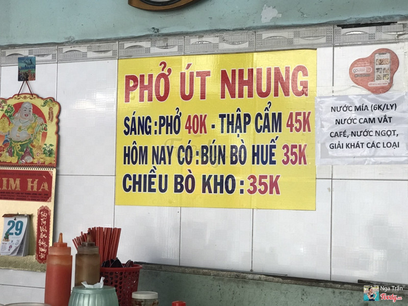 8.2Út Nhung - Phở & Bò KhoThèm bò kho thì lựa chọn duy nhất của mình là Út Nhung :D Với 1 đứa ăn nhiều như mình thì ở đây là cực hợp lý luôn nha . Giá cả 35k 1 tô là quá trời bò , miếng nào miếng nấy bự cả tảng . Ngoải ra còn có đủ gia vị cho mình nêm nếm . Mấy anh chị phục vụ nhiệt tình lắm . Không gian sạch đẹp thoáng mát . ...Xem thêm