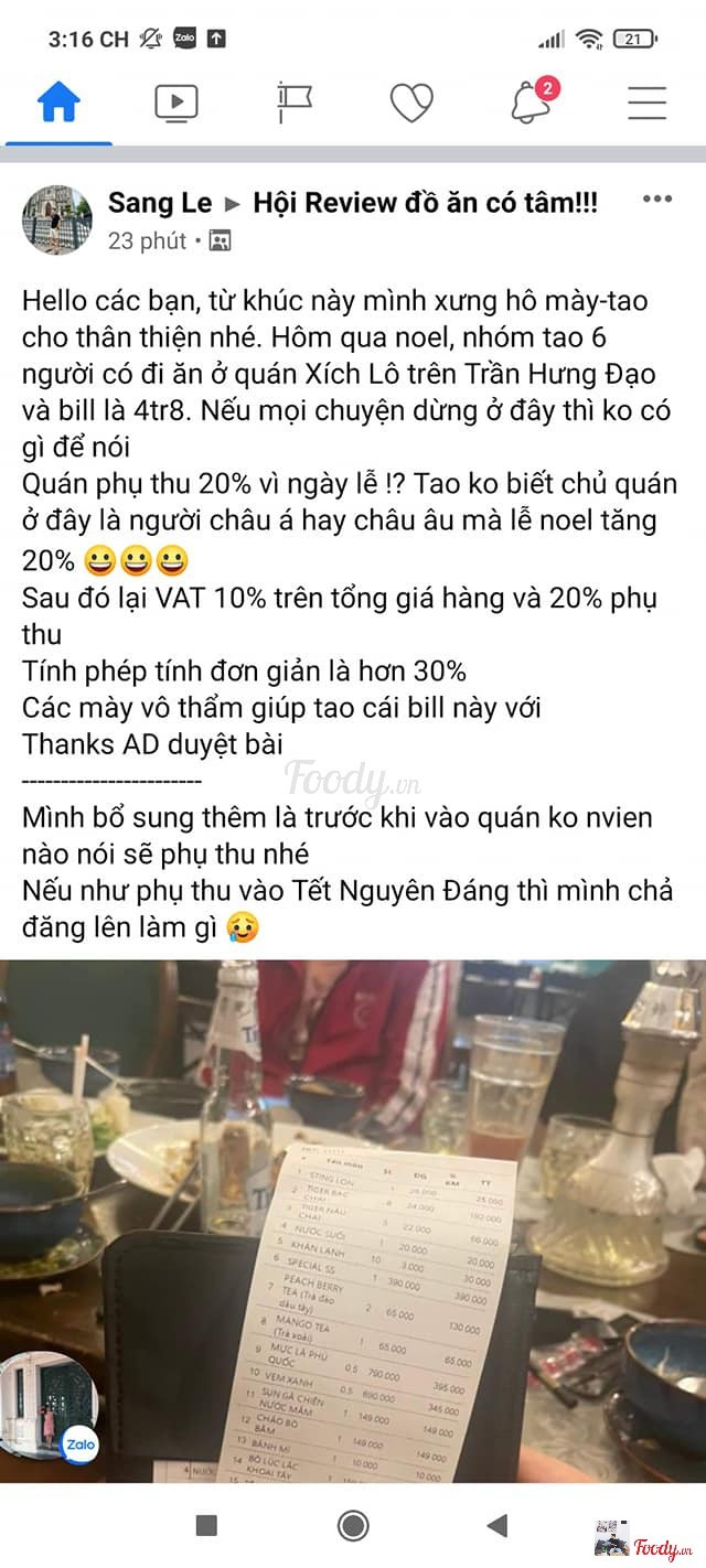 1.0Kinh doanh khôn lõiPhụ thu trên món gọi 20% trên món gọi rồi bao gồm cả phụ thu 20% để tính VAT 10%. Tính sơ cũng hơn 30-40% trên món gọi. V là đi ăn cướp hay đi kinh doanh. Ai tổ chức tiệc tùng gì nhớ né ra ...Xem thêm