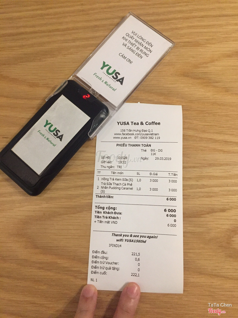 7.2YUSA Tea & Coffee - Trần Hưng ĐạoMình đã uống quán này vài lần vì bị thích món trà sữa mix đặt biệt Yusa. Lần đầu mình uống trà sữa sương sáo Lần thứ 2 mình uống trà sữa mix đặt biệt Yusa ( đủ lại trân châu, toping các kiểu ) Uống xong bị thích nên lần nào đến quán cũng uống món đó _ Vị trí: nằm gần khách sạn Pullman _ Không gian: có bàn ngoài trời và trong nhà, có chổ giữ xe miễn phí _ Giá cả: 42k cho 1 ly trà size S _ Chất lượng: ok _ Nhân viên: nhiệt tình, thân thiện ...View more