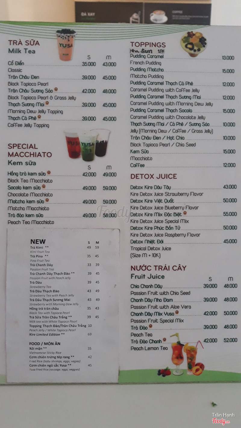 9.0Ngon lạ và sạchQuán này có mấy món nước lạ mà ngon, cà phê sữa đặc biệt có vị đậm đà thơm lắm, khác hẳn những nơi khác, uống hơi sệt sệt, chất lượng. Fruit delight có nhiều loại trái cây nguyên quả trong ly, Detox kire thơm mùi sả uống thấy thư giãn dễ chịu, mình ưng quán là chỗ ko xài suryp mà chỉ có trái cây tươi nguyên chất có mỳ ý đã thử, thịt sốt thơm, cơm sandwich đủ thứ mà chưa có dịp thử hết, sẽ quay lại trải nghiệm dần dần vì rất thích sự nhiệt tình của nhân viên, không gian cũng đẹp và quan trọng cảm giác mọi thứ rất sạch sẽ, nghe nhân viên giới thiệu thương hiệu được chuyên gia Nhật tư vấn, chắc có lẽ vậy mà mình thấy mọi thứ có vẻ chỉnh chu, chọn Yusa làm điểm đến yêu thích thường xuyên nha, ah có trà sữa púdding cũng ổn lắm, menu nhiều lựa chọn ^^ ...View more
