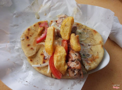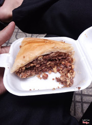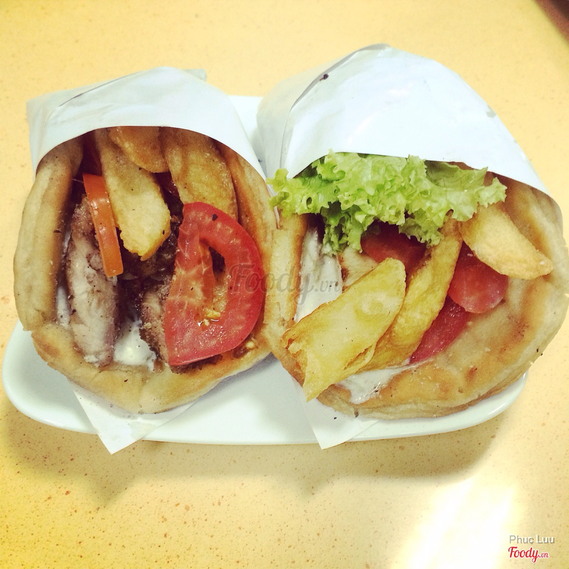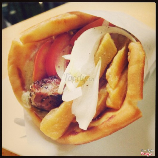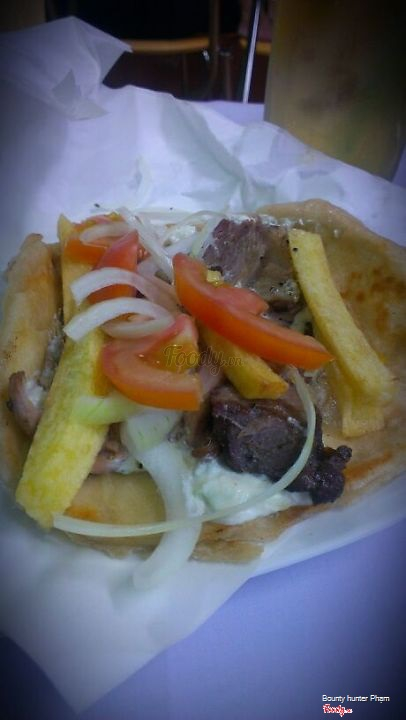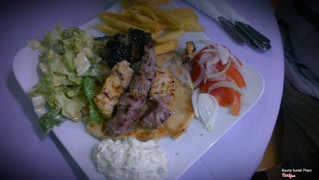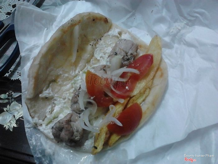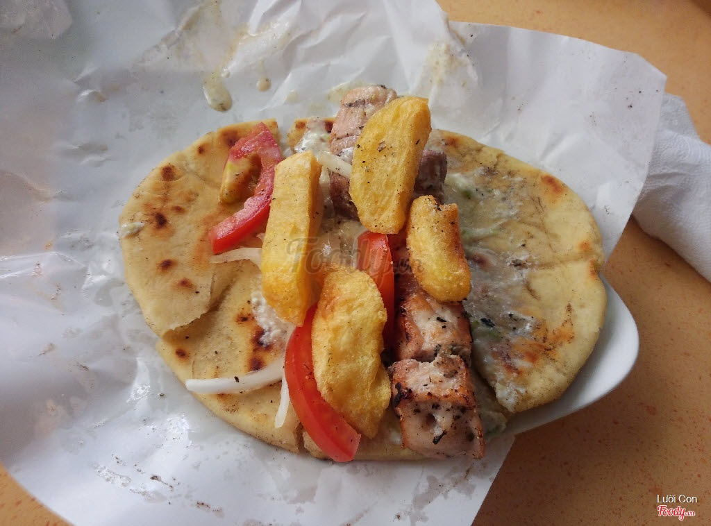 Tên món ăn: pita heo nướng gà nướng xiên Mô tả: Bánh pita ăn hơi dai, chắc do bột mềm quá nên vậy. Ăn kèm heo nướng xiê, gà nướng xiên, ướp hơi nhạt, ăn được thôi Giá cả: tầm 40k