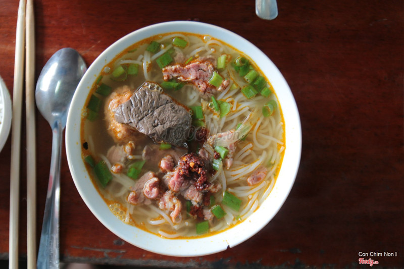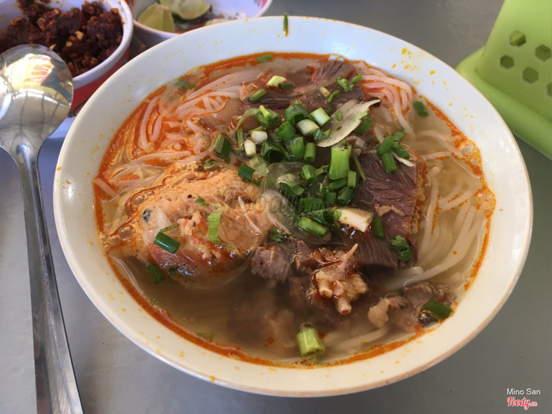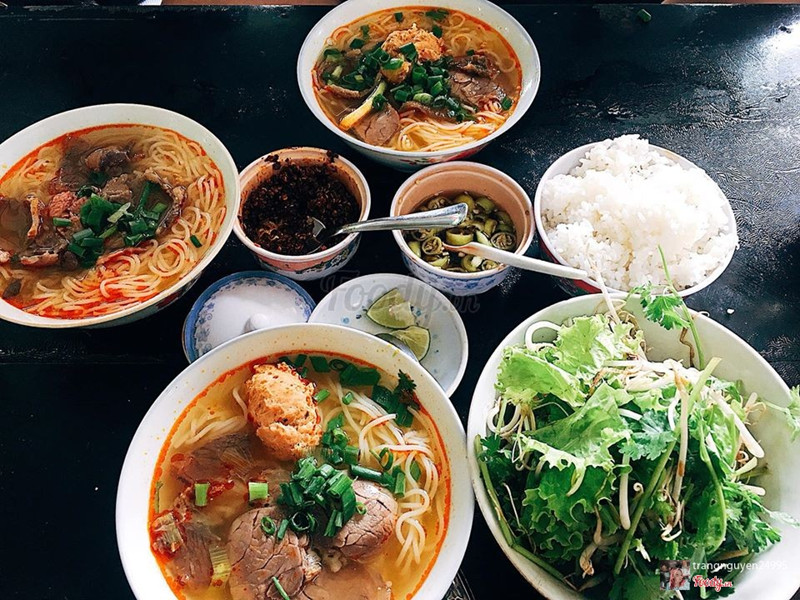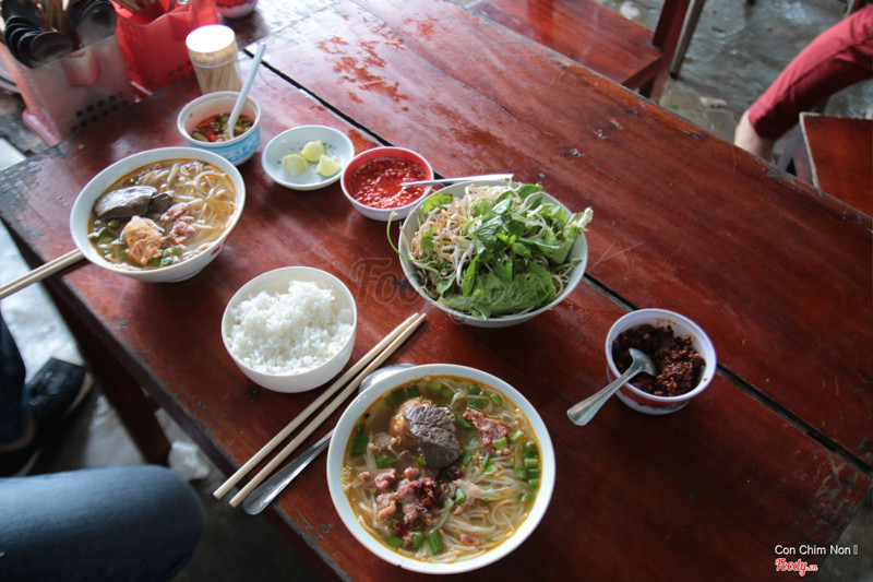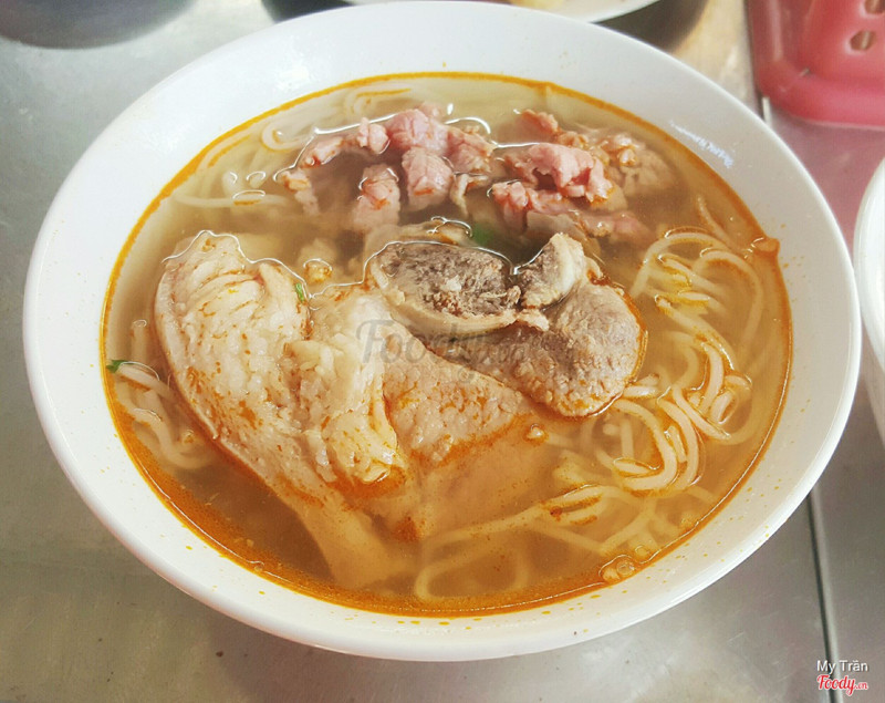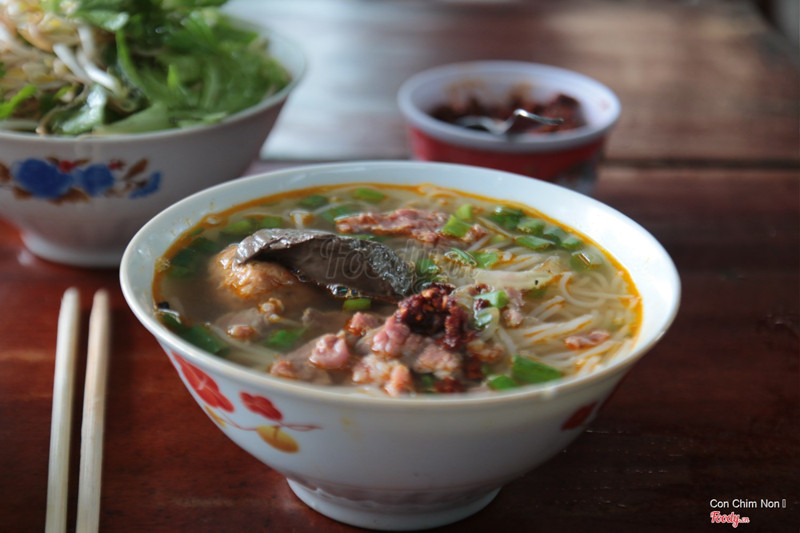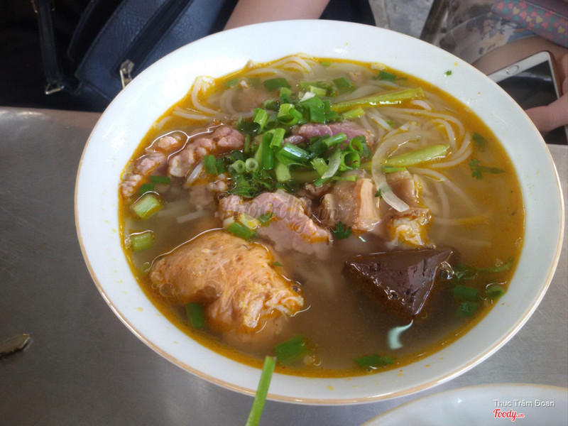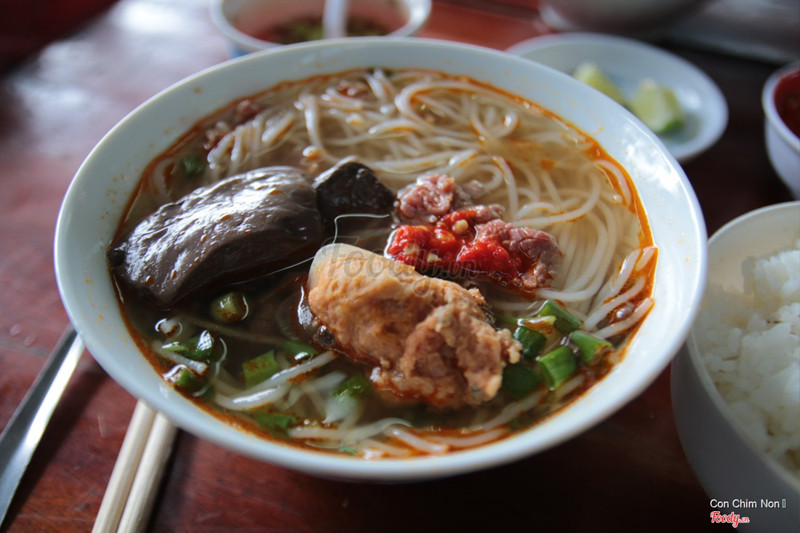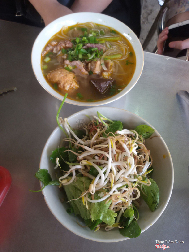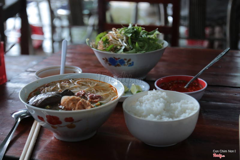9.0Dì Vân - Bún Bò Cơm NguộiTừ chợ Đông Ba qua cầu Gia Hội rồi rẽ phải đường Trịnh Công Sơn,quán nằm bên trái - bên trong con đường đất khoảng 20 mét từ đường Trịnh Công Sơn.Ngoài món bún với giò heo,thịt heo ba chỉ,sườn heo...mọi người có thể yêu cầu thêm món cơm nguội để ăn cùng.Quán có món thích bún xương bò,gân bò khá ngon. Đây là quán rất bình dân vì giá khá rẻ so với mặt bằng chung - từ 15000 đồng đến 25000 đồng.Quán chỉ mở cửa buổi sáng đến khoảng 11 giờ.Mặc dầu khách khá đông nhưng phục vụ nhanh,vui vẻ. ...Xem thêm