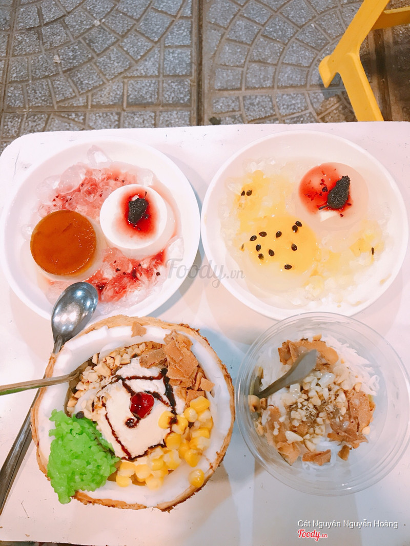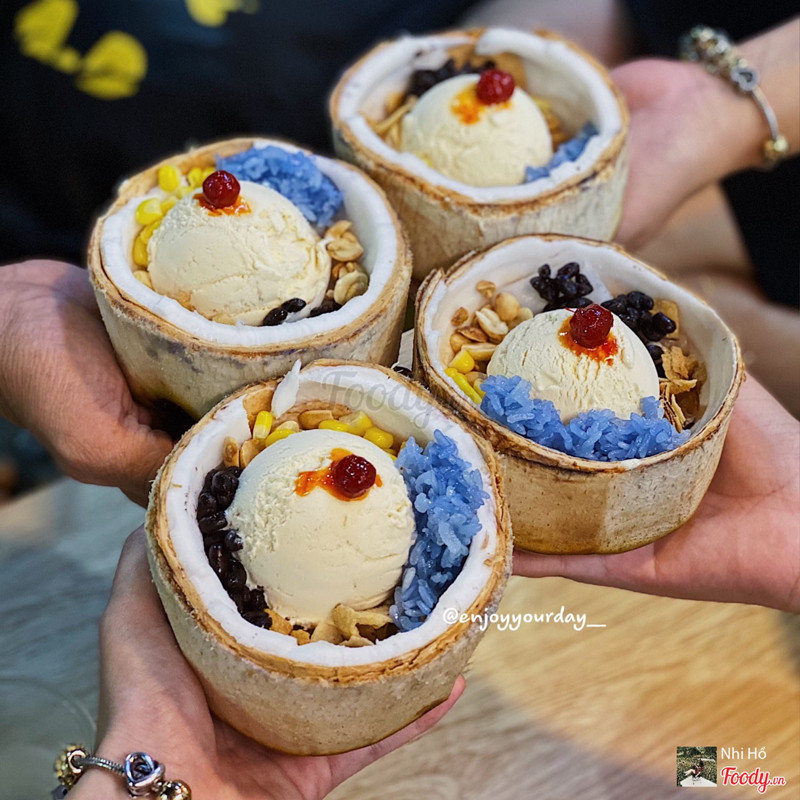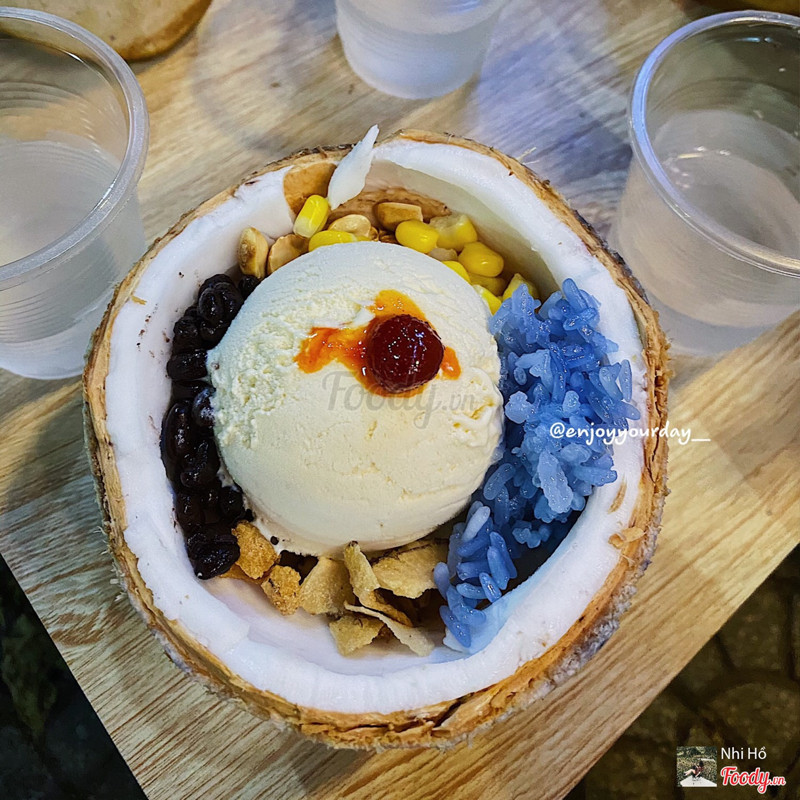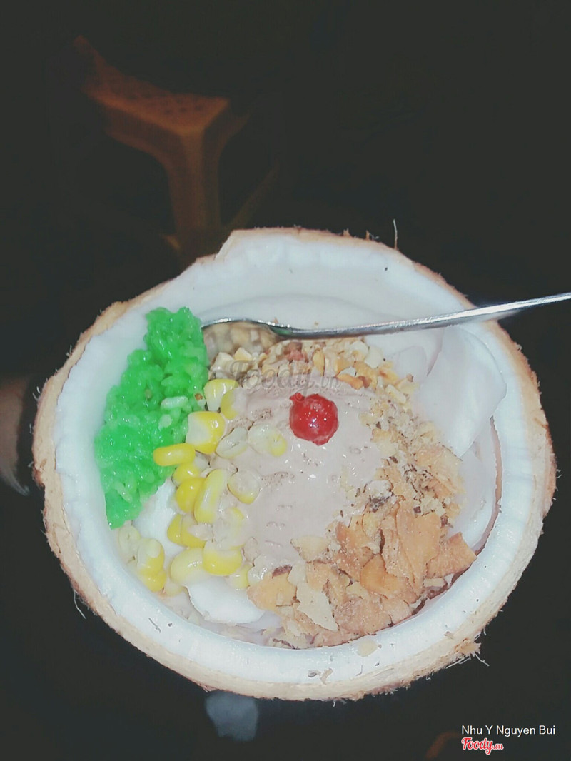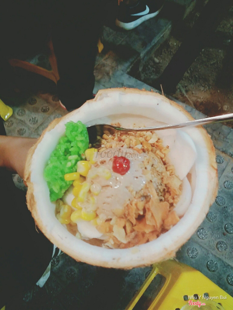 7.2Kem Xôi DừaTrộm vía là mình được rủ đi thử kem xôi dừa thì bạn mình chở đến đây. Ăn cũng ngon lắm ạ, kem rất ok, xôi theo mình dẻo ngon dù màu xôi hơi ảo diệu một tẹo. Mình và người yêu có kêu thêm flan combo gì đấy, tại ra sau ham ăn quá quên chụp hình mất tiêu. Flan không ngon lắm đâu ạ, không béo béo mịn mịn như chỗ khác, nước caramel với hạt thạch hay nho khô gì đấy mình không nhớ rõ, được để trên flan, như topping í ạ. Kem xôi dừa được bỏ trong trái dừa, sáng tạo mà nhìn cute cute. Nói đến không gian quán thì nhỏ lắm ạ, vì là vỉa hè, ghế đc xếp như bàn, bàn đc xếp như ghế, 2 đứa bọn mình đều cao như cây cột ngồi ghế thấp thấp hơi khó ăn nhưng không sao, hại là bọn mình hơi cao thôi. Ngồi đây bữa tối cũng mát lắm ạ, tính ra cũng không nóng mấy. Nói chung mọi người nên tới thử cho biết nha. ...Xem thêm