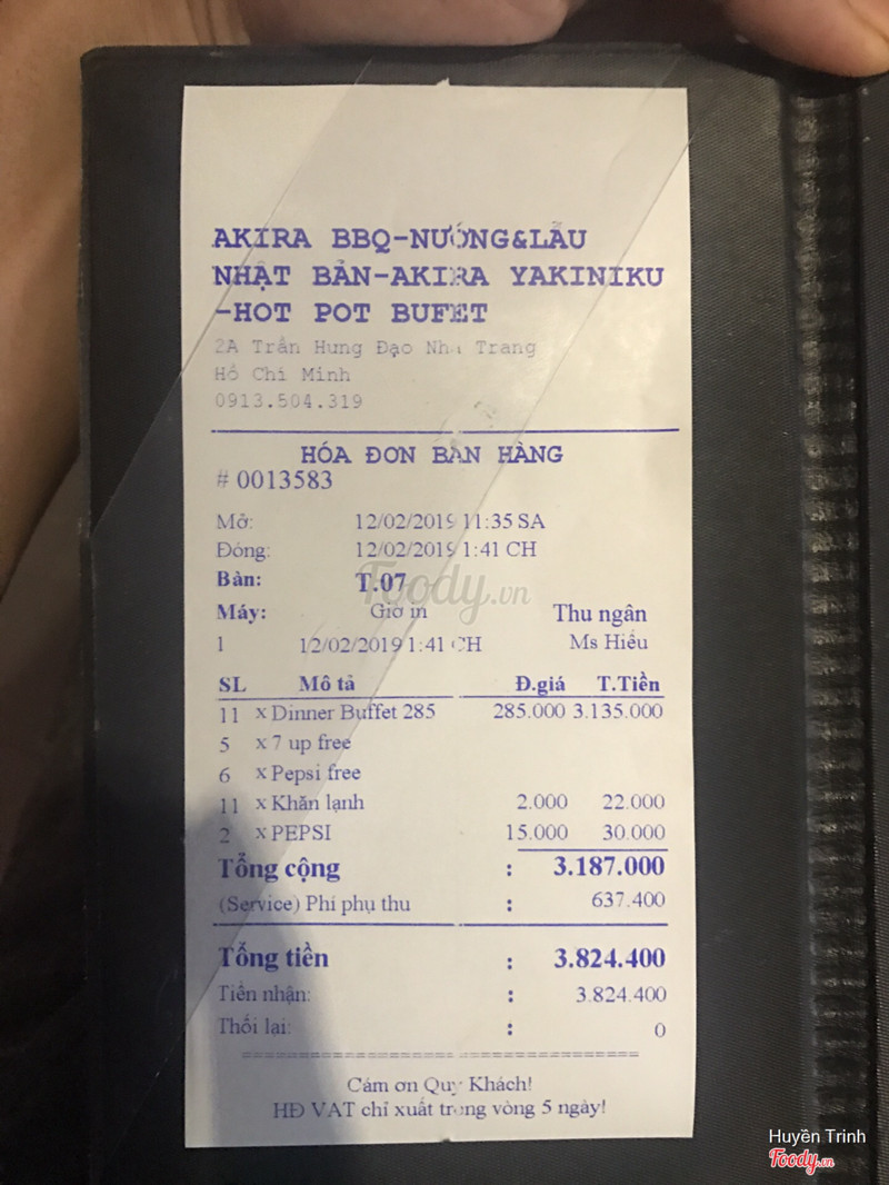 4.2AKIRA BBQ - Buffet Nướng & Lẩu Nhật BảnMình đặt bàn trên app này, thấy thời gian hoạt động của quán là 10:00 - 22:00 . Mình đến quán lúc 13:00. Ngồi được 30 phút thì nhân viên đến yêu cầu mình gọi món vì 13:45 BẾP NGHỈ. Vậy sao lúc khách đến nv ko thông báo cho khách, ăn buffet rất lâu mà còn bf nướng nữa. Lúc oder đồ ăn thì bạn nv đó ko thèm lấy giấy bút ghi lại mà còn quay mặt ra cửa. Thái độ kiểu quán sắp nghỉ rồi còn gọi đồ ăn ý. Trong khi nhà mình đi có cầm theo bánh kem vì là sinh nhật Mẹ. Ngồi ăn thì mấy cô tạp vụ nhìn chằm chằm, sushi ở quầy cũng mang vào cất hết. Nếu bếp nghỉ 13:45 mà khách vào lúc 13g thì phải thông báo với khách. Vì mình có nói là đặt bàn trên table now! Ngồi đợi nv mag nước mang gia vị và khách xem menu là đã hơn 20phut rồi. Làm ăn ko ngon miệng mà cũng ko hài lòng nữa! Mong quán xem lại!!!! ...Xem thêm