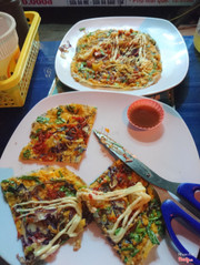 7.8Bánh Tráng Trứng & Trà SữaQuán này nằm trên mặt tiền đường Dã Tượng, gần chỗ Công an nhân dân nên dễ tìm, quán này cũng chỉ là quán lề đường thôi, được cái nằm ở hướng biển nên ngồi rất mát. Menu khá đa dạng, có nhiều loại bánh tráng trứng, tha hồ lựa chọn. Mình gọi 1 Pizza thập cẩm (20k) và Pizza bò + phô mai (15k). Pizza bò + phô mai ăn ngon, vỏ bánh tráng giòn rụm, ăn có thịt bò khô cay cay với phô mai beo béo rất là đã. Pizza thập cẩm theo mình là món ngon nhất, 1 trời topping luôn, ăn sướng miệng quá trời :)). Đợi bánh lên cũng không lâu lắm, chắc chắn mình sẽ còn quay lại. ...Xem thêm