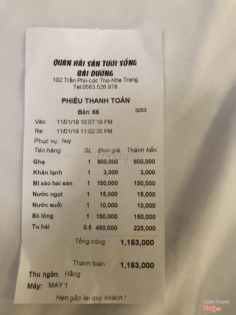 1.6Tạm biệt Bãi Dương 102 Trần PhúChuyện là như thế này. Trưa 31/03/2019 mình cùng vk ghé quan chọn đồ ăn, trong lúc lựa hải sản con bán hải sản mặc áo thung sọc trắng đen nói chuyện làm người khác phải khó chịu. Mình đi 2 người kêu mỏi thứ 0,5kg ăn vừa đủ, nó kêu lấy 1kg mình không chịu cái nó nói mới sáng mở hàng gặp gì đâu, mình nghe là khó chịu rồi. Rồi tiếp tục lúc hỏi giá sò bao nhiêu 1kg thì nói lụa trắng 250k lụa đỏ 150k nên mình chọn lụa đỏ, nhưng đến lúc tính tiền thì lụa đỏ nó lấy mình 250k 1kg. Chưa hết hào 150k 1kg mà mình lấy 2 con 0.8gam ra toàn vỏ không. Mình muốn thông báo đến các bạn khi ra nha trang tránh xa Bãi Dương nhé ...Xem thêm