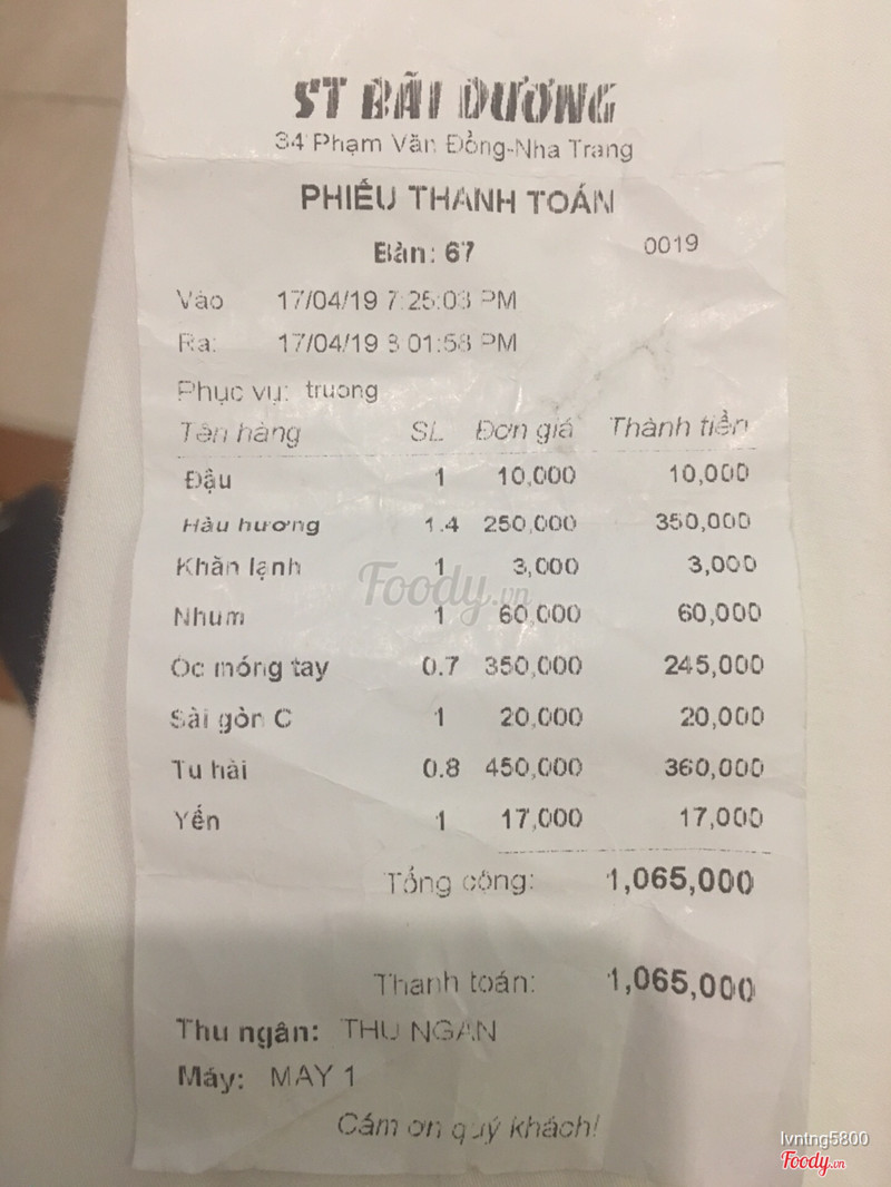 5.0Ngon nhưng quá đắtĐi NT cũng nhiều và cũng biết chỗ nào taxi dụ đến là k ổn, lần này cũng vậy, bị dụ đến đây với câu chuyện bác ấy thường xuyên ăn vì giá rẻ, nghe cũng có vẻ k ổn nhưng thôi cũng qd đi. Hỏi giá mà con nào cũng giá trên trời, lỡ theo lao rồi nên mình ăn mỗi thứ 1 ít. Hải sản tươi, ngon, điểm này bù lại cho cái giá. Ghẹ thì 400k/kg (mẹ ơi con có bé tí), bào ngư 500k/kg, sò chén 500k/kg (mình lấy 2 con mà nửa kg 250k, thịt k có bn, đau tiền nhất là con này), nghêu xanh 250/kg (ngon ngọt nhưng giá vẫn đắt quá), tôm hùm mình lấy con nhỏ 1.2tr/kg (món ngày tuyệt vời nên mình thấy xứng đáng) Nói chung ngon nhưng quá mắc thôi. K dám quay lại lần nữa :)) ...Xem thêm