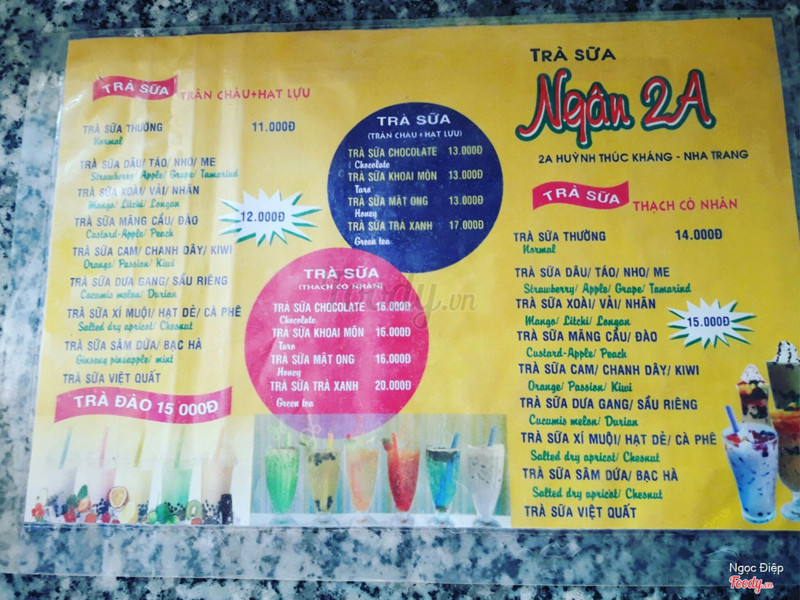 7.0Ngân 2A - Trà Sữa Thạch Có NhânĐây cũng là một quán trà sữa khá lâu đời ở Nha Trang. Ghé mua mang về 3 ly trà sữa thường 14k 1 ly, có tầm 4,5 viên thạch có nhân ăn khá ngon, trân châu mềm dẻo, trà sữa béo thơm. Được cô chủ quảng cáo về các nguyên liệu làm trà sữa, thạch, trân châu hoàn toàn đều là hàng của công ty Việt Nam mình sản xuất nên yên tâm về chất lượng. Mình đi buổi sáng sớm khách khá vắng, chủ yếu là khách đến mua mang về. Không gian quán cũng được 5, 6 bàn. Là quán nhà làm nên cũng tận tình vui vẻ phục vụ. Điểm trừ là keo đóng nắp hộp bị hở, khi lắc trà sữa để uống bị đổ tùm lum hơi bực mình tí. ...Xem thêm