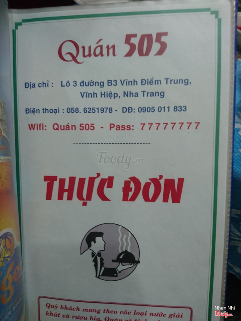8.2Quán 505 - Quán Ăn Gia ĐìnhQuán này nằm tít dưới khu Vĩnh Điềm Trung lận, nhưng mà nhờ vậy mà mới có chỗ rộng rãi để đậu xe. Không gian quán rộng, sáng sủa và sạch sẽ, nhìn không hề gống quán nhậu tí nào, mình thấy thiên về dạng quán ăn gia đình hơn. Menu cực kỳ phong phú và đa dạng, có vô số món từ lẩu, cơm món, mì ý, hải sản, thịt heo rừng đến thịt gà, nói chung gần như món gì cũng có bán. Mình gọi Lươn đùm (75k), Hoành thánh chiên (55k), Bắp xào hành (30k) và Bê nướng muối ớt (90k). Nói chung các món ăn đều ngon, lại được chỗ ngồi thoải mái nữa nên mình khá hài lòng. Có thể mình sẽ còn ghé lại. ...Xem thêm