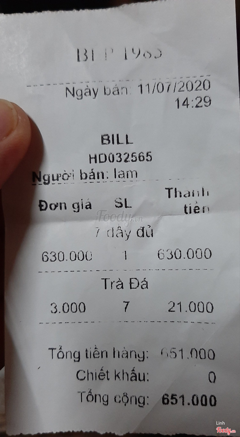 Hôm mình tới có món cá điêu hồng, vịt măng mà đem món cá biển với trứng chiên ra, quán hết món nên đổi mà không thèm hỏi ý khách. Đồ ăn không ngon mà còn ít, bản thân cá và rau đem lên nhạt như nước lã cũng kém chất lượng. Chắc chắn không quay lại rồi. Lúc ăn hết hồn lúc tính tiền còn hết hồn, nếu ngon thì bao nhiêu cũng không tiếc. À có 1 điểm quán rất thông minh trên bil chỉ ghi 7 đầy đủ ko phải 7 món mà là 7 người ...Xem thêm
