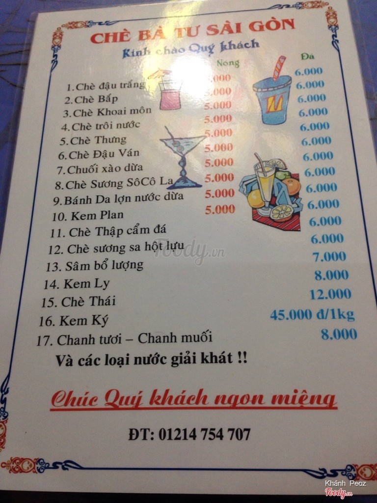 8.0Chè Bà Tư Sài Gòn - Phù Đổng Thiên VươngĐồ ăn siêu ngon, giá siêu sinh viên luôn Anh chủ cực dễ thương luôn nha mn, đã ghé rất nhiều lần tại đây😊😊😊 ...Xem thêm