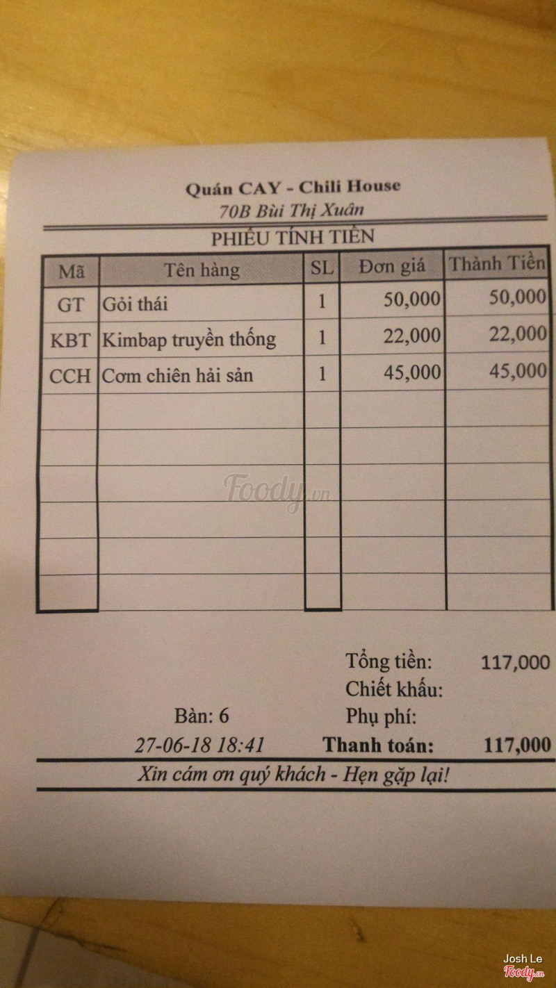 7.2Chili House - Quán CayĐồ ăn ở đây ngon, cũng khá nhiều món để chọn. Nhưng theo mình giá vậy hơi cao, ăn vặt thì đâu có ăn 1-2 món là xog. Mỗi món đc một ít, muốn ăn no cũng phải gọi 5-6 món, tính vậy thì so với túi tiền trung bình của sinh viên là hơi cao. ...Xem thêm