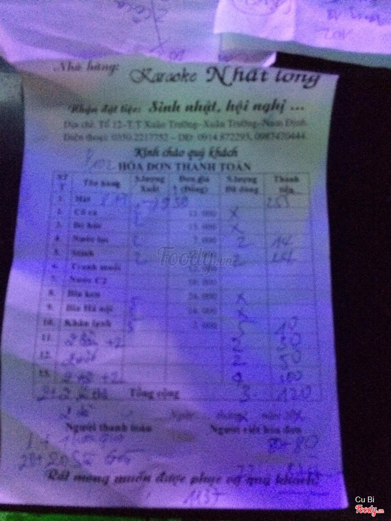 7.4Quán karaoke lớn và tốt nhất huyệnQuán thuộc đường mới của thị trấn xuân trường.Quán lớn khá nhiều phòng,chất lượng dịch vụ có thể nói là tốt nhất huyện. Hôm m đến vào mùng 3 tết lên rất đông khách. Quen biết mới đặt đc phòng vào xí chỗ trước bao người đứng ngoài chờ^^.Chất lượng âm thanh khá tốt.Phục vụ nhẹ nhàng.Giá cả phải chăng.Mấy anh chị em cùng mấy nhóc con đánh chén 2 đĩa hoa quả, mấy gói bim bim,nước ngọt và hơn 1 két sì gòn lùn.Hát khoảng 2h. Tổng thiệt hại hơn triệu mốt xíu.Nói chung quán này m sẽ nhìu dịp ghé thăm. Hee vì cả huyện cũng chỉ nhất long này là khá nhất ...Xem thêm