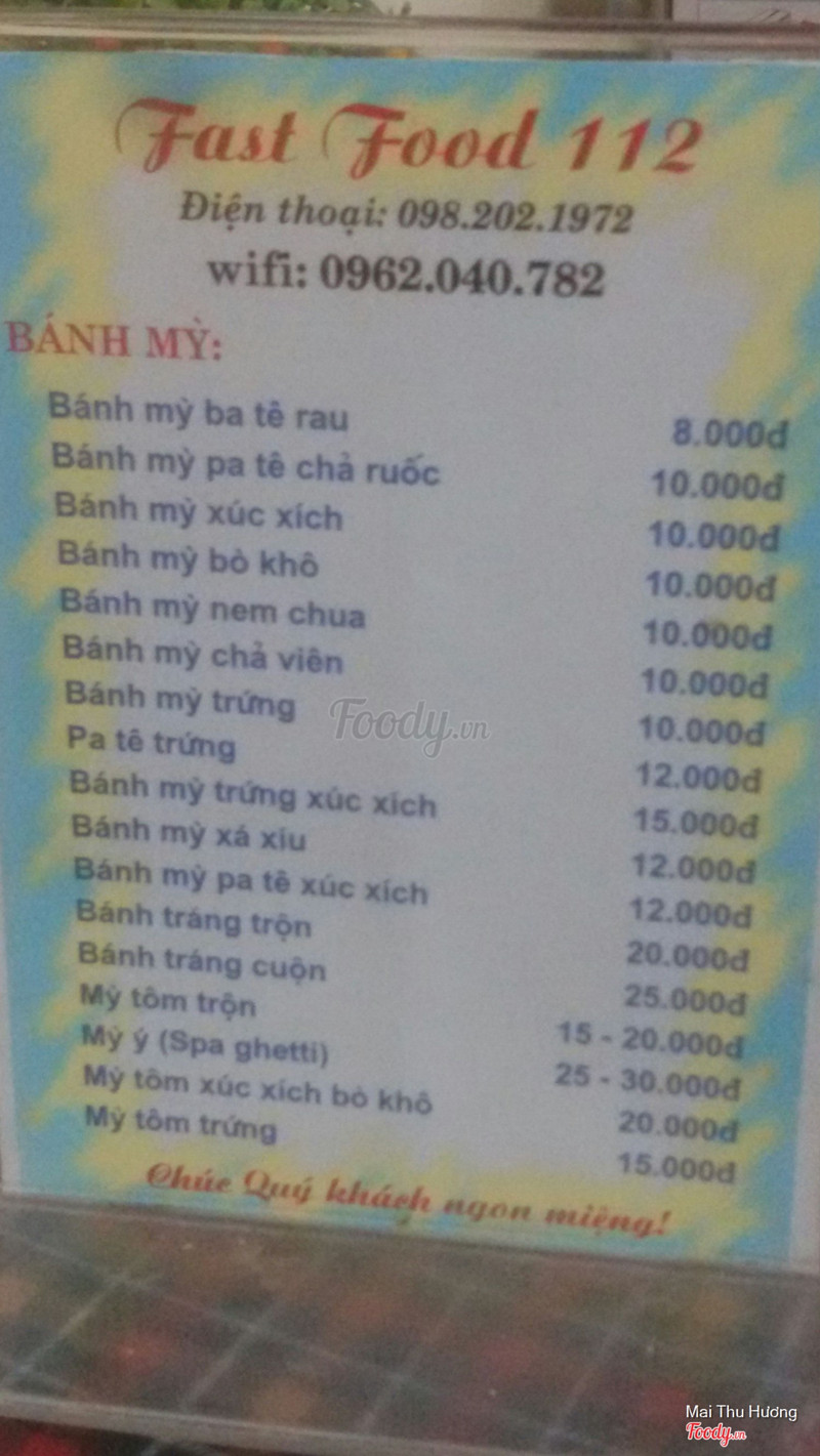 6.0Fastfood 112Quán ship đồ ăn nhanh cũng là một quán ăn vặt bình thường nằm gần trường trương hán siêu mình ghé vào ăn 1 lần rồi thấy cũng bình thường không có gì đặc sắc đây la menu của quán ...Xem thêm