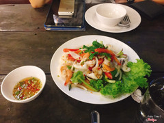 8.2Pupen Seafood Restaurant🐠 Hôm tụi mình đi dọc biển tìm quán hải sản để ăn tối, thấy quán này đông lại ngồi kiểu không gian mở có view biển nên vào luôn. - Không gian quán rộng rãi, bàn ghế gỗ cũng kiểu lâu lâu rồi ấy, tụi mình ngồi được ngay bàn ngoài, thoáng mát lại còn tha hồ ngắm biển đêm. - Đồ ăn tụi mình thử mấy món đều thấy ngon, ở đây chế biến rất hợp khẩu vị. Salad hải sản trộn chua ngọt ngon, mực chiên trứng muối vàng ươm thơm lừng. Lẩu Thái cua đặt trong nồi nhìn hay phết, hương vị thơm đặc trưng luôn. Mà ở đây có quả đập cua hơi bị hay, giống y bộ chày thớt bên mình :))) - Nhân viên phục vụ thân thiện, biết xài tiếng Anh. - Giá cả hợp lý, không cao. ...Xem thêm