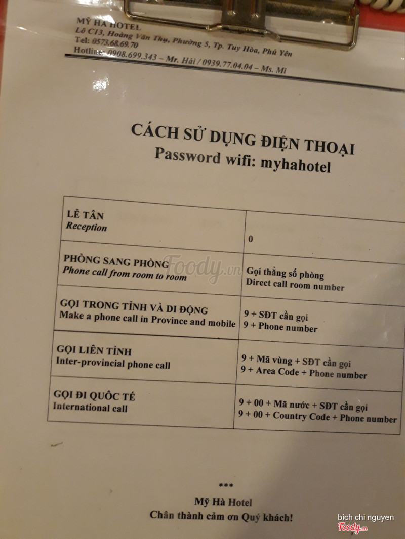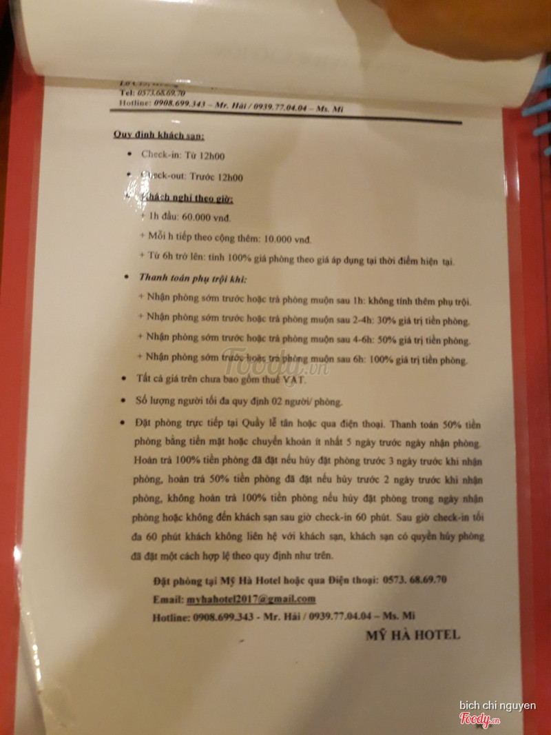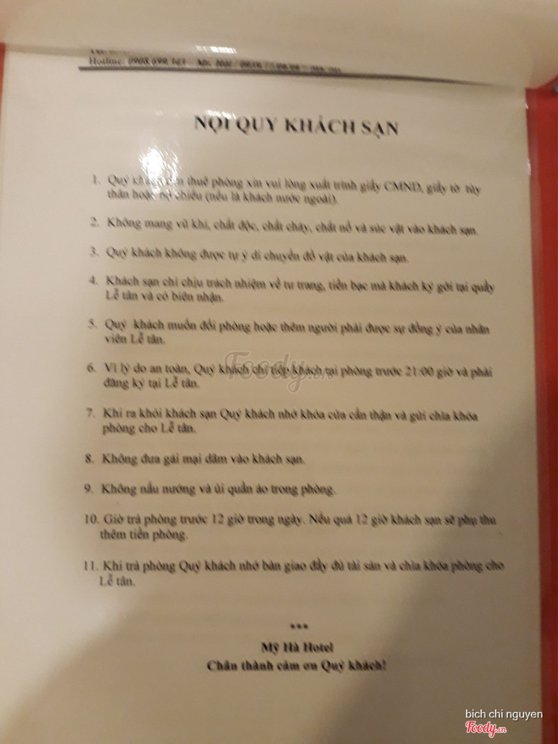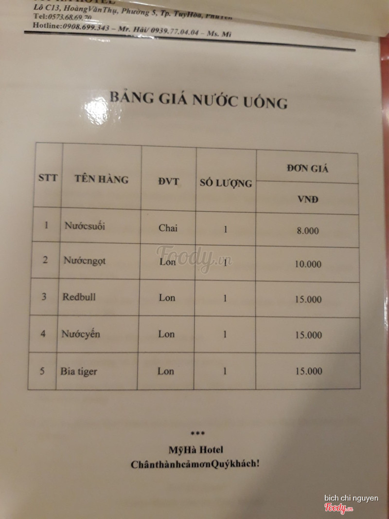 8.0Mỹ Hà HotelKhách sạn nằm ở đoạn đường Hoang Văn Thụ ngay đường Hùng Vương. gần siêu thị Vin com Giá phòng: phòng không có cửa sổ 200k/1 đêm/2 khách phòng có ban công 250k/1 đêm /2 khách Phòng 2 giường 4 khách 350k_ 400k Nhân viên lễ tân và chủ nhà nhiệt tình chu đáo Phòng có máy lạnh. tủ lạnh. quạt gió . máy nước nóng lạnh để tắm có thể mượn thêm bình đun nước nóng và náy sấy tóc Ngày đầu mình ở mình có mở tủ lạnh thấy có 2 chai nước suối Vậy mà đến đêm thứ 4 chỉ còn 1 chai ( không biết ai uống) vì mình ở đến 5 đêm. Ngày thứ 3 mình đi chơi từ sáng đến tối về thì thấy cửa phòng không khóa!!!!! Mình có đi siêu thị để mua kiwi ăn mà để quên trong tủ lạnh mà chủ khách sạn dọn phòng không báo chỉ báo mình có uống 1 chai nước suối. mình khắng định mình ko có uống mà cũng phải tính tiền . Do đó các bạn chú ý nha. kiểm tra tủ lạnh hằng ngày. Vì trước đó mình cũng có thấy khách nói không uống nước trong tủ lạnh mà vẫn bị tính tiền !! Khăn tắm bị lủng to. phòng 2 ngày mới dọn 1 lần. ...Xem thêm