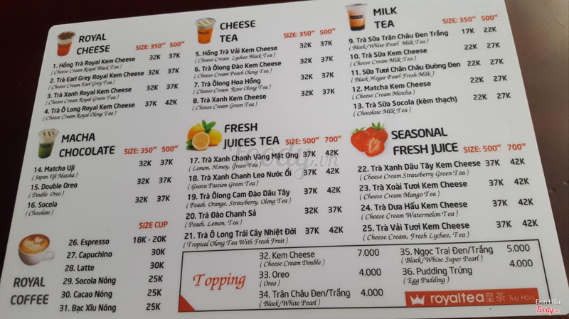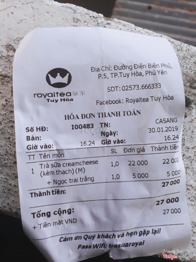 5.0Cũng tạm đượcNghe Tuy Hòa có Royal Tea nên đi uống. Menu quán rẻ hơn so với hệ thống ở TP HCM. Lần đầu uống trà sữa kem cheese kèm thạch ( thạch chocolate). Mình có nói là đổi qua trân châu trắng được không bạn nhân viên nói được nhưng ra bill thì lại là thêm thạch. Mà thôi cũng không sao. Trà sữa kem cheese không ngon kem rất béo. Trân châu cứng không mềm. Mình có nói 50% đường mà chắc cũng bỏ như bình thường. ...Xem thêm