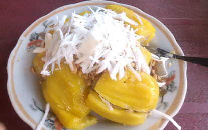 Lê AcridinGhé Tam Kỳ chơi và được bạn dẫn tới đây ăn thử. Mít hông ăn cảm giác khá lạ và thấy hay hay. Hột mít giã nhuyễn được nhét vô múi mít tròn tròn vàng ươm đem hông, ăn kèm với đậu phộng giã dập và dừa bào, trông dĩa mít rất bắt mắt. Nhưng không biết do trời lạnh hay do mít hông trước để lâu mà lúc ăn thấy ...