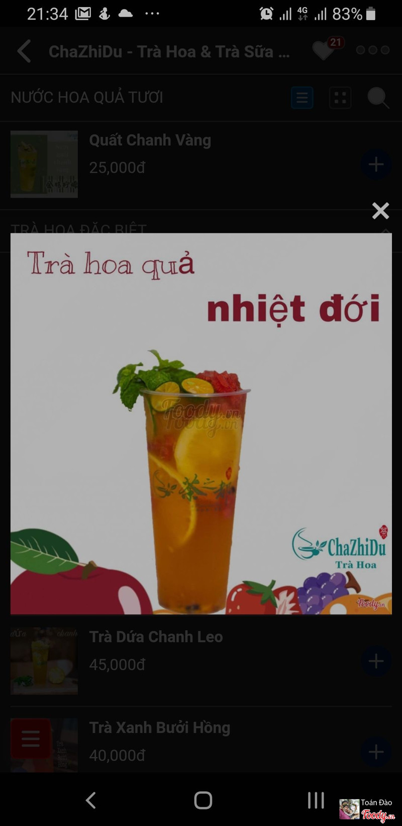 3.0Trà hoa quả nhiệt đới 45k, không khác gì nước chanh leoBan đầu đặt 2 cốc trà sữa nướng tại quầy lễ tân,ngay tức khắc sau đó xin đổi 1 cốc trà sang trà hoa quả nhiệt đới, nhân viên bảo in hóa đơn rồi, không đổi dc trong khi chưa thanh toán, chưa có trà. Tuy nhiên sau đó nv vẫn đổi sang trà hoa quả nhiệt đới, nhg khi uống thì toàn thấy chanh leo là chính, có vài mẩu dưa hấu, vài lát chanh và quất. Uống không khác j một cốc chanh leo 12k! Nhìn cốc như ảnh tại quá hấp dẫn thế mà thực tế thì...haiz, đúng là quảng cáo! Không biết nv có nhầm lẫn j không, nhưng chắc không có lần sau quay lại quán này. ...Xem thêm