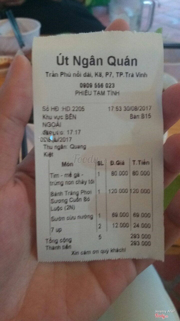 8.4Út NgânMÌnh có dịp đi về Trà Vinh thì được bạn giới thiệu quán Út Ngân này, cũng là một trong những địa điểm khá nổi tiếng của Thành Phố Trà Vình. Mình tới tầm hơn 5h chiều tí thì quán cũng khá đông rồi, quán nhìn thoáng, gọn gàng. Nhân viên rất tử tế, ngay cả người giữ xe. Họ phục vụ nhanh, và chu đáo, tiếp viên bia cũng vậy mặc dù không dùng đúng loại bia em ấy đang tiếp thị. Nghe giới thiệu ở đây nổi tiếng là món trứng non cháy tỏi. Trong đó bao gồm trứng non, lồng gà như mề, tim gà,... Chế biến ngon, rất vừa ăn, thế mà chỉ có 80k trong khi đồ ăn khá nhiều. ...Xem thêm