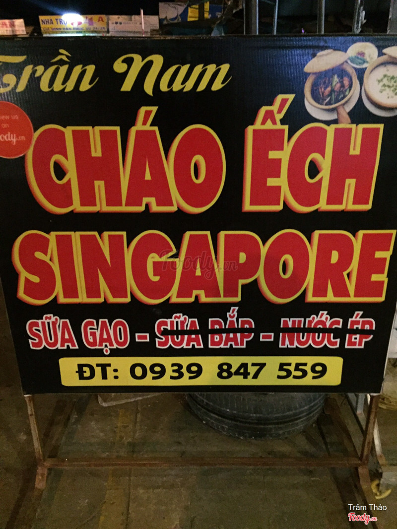 8.2Ngon hú hồn con chồnRì viêu quán Cháo Ếch Singapore TRẦN NAM QUÁN (bên hông Bến xe mới, kế quán cơm tấm An Bình) ngon hú hồn ở P8-TPVL Cháo ếch Singapore chỗ này giống gần 95% cháo ếch Singapore chính hiệu (5% còn lại là đặc trưng của quán). 25k gồm 1 thố ếch kho nức lỗ mũi và 1 tô cháo trắng hương lá dứa. Nói thiệt là đó giờ ko bik ăn cháo trắng mà bik món này là ăn được luôn. Vị nêm nếm rất vừa miệng. Ếch tươi, con nào con nấy cái đùi nó bự như cây cột dậy, thịt rất ngọt luôn. Bưng thố ếch ra sôi ùng ục, có gừng, tiêu, hành nó thơm thì miễn nói rồi. Bưng tô cháo ra là quất liền tay. Mưa này mà ăn cháo ếch là hết bài luôn. Ngoài ra thấy quán có món phở trộn với mì cay. Phở trộn chưa ăn, còn mì cay thì khác với tất cả quán mì cay khác nhen. Thấy mấy quán kia hình như có 1 vị 1 hà, còn chỗ này vị khác, ăn rất đặc biệt mà chỉ ên TRẦN NAM QUÁN mới có. Có lần đi ăn được đốt đèn cầy lãng mạn vãi đạn luôn. Ai chưa ăn thì ghé ăn thử nhen. Thấy 25k/phần cháo mà bao ngon bao no. Anh chủ dễ thương, chị phục vụ đẹp gái lắm nha. Lần nào lại cũng vui vẻ tưởng quen trăm năm rồi á. Ai chưa ăn thì ghé ăn thử nha. Chứ tui là mai mốt j đi ăn à. Ngồi rì viêu mà nước mũi nước dãi chảy lòng thòng luôn. Kkkkkk ...Xem thêm