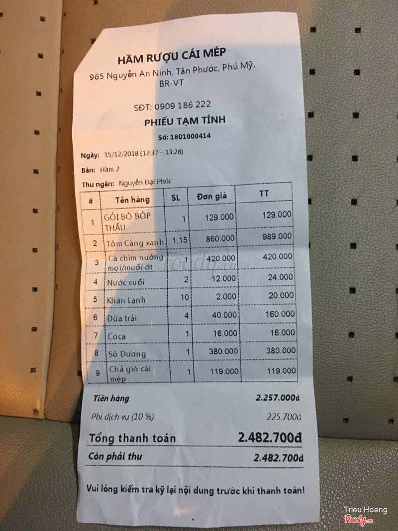 1.0Nhà hàng làm việc thiếu chuyên nghiệpVào tiếp khách tại nhà hàng, trước khi bước vào đã hỏi trước có hóa đơn VAT thì nhà hàng bảo ok. Đến khi thanh toán thì báo là không xuất hóa đơn được phải đợi vài ngày. Đến lấy 2 lần thì nhà hàng bảo VAT đã được chuyển về cty, chờ thông tin gọi lại và không được ai báo. Đến 15 ngày sau khi gọi điện đến thì báo là cách đây vài ngày đã có người nhận, hỏi là ai nhận cũng không có thông tin, xem như mất hóa đơn. Thật sự vô cùng thiếu chuyên nghiệp. Tuy giá trị hóa đơn không bao nhiêu nhưng làm việc không trách nhiệm thế này vô cùng ảnh hưởng khách hàng. Ai có ý định tiếp khách thì tránh nơi này ra! ...Xem thêm